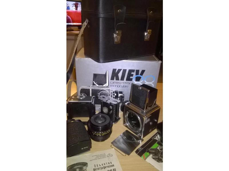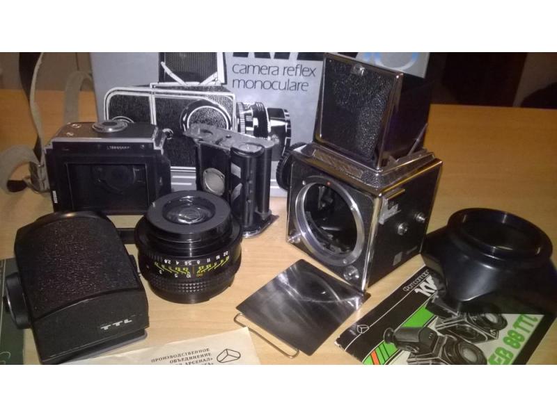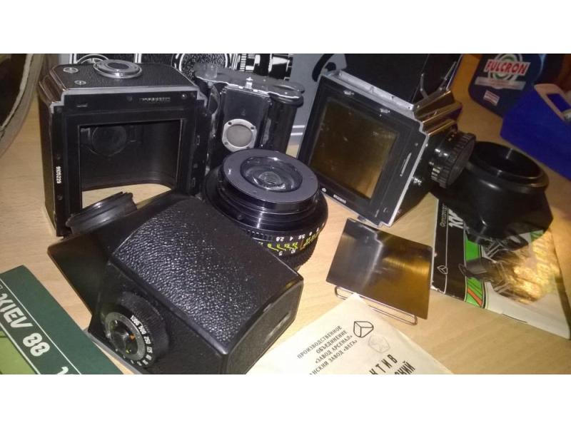 Fotocamera tradizionale a pellicola rullo, KIEW 88 formato 6x6. Perfettamente funzionante, in ottimo stato di conservazione. Dotata di obbiettivo standard , coperchio antiriflesso ottica, pentaprisma TTL, pozzetto in dotazione, astuccio, istruzioni, e scatola imballo originale.
