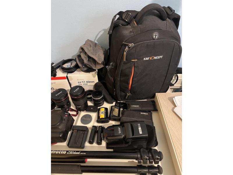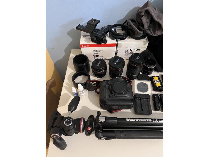 Canon Eos 1 DC + 100 mm f2.8 L + 50mm f1.2 L+ 17-40mm f4 + manfrotto Lotto