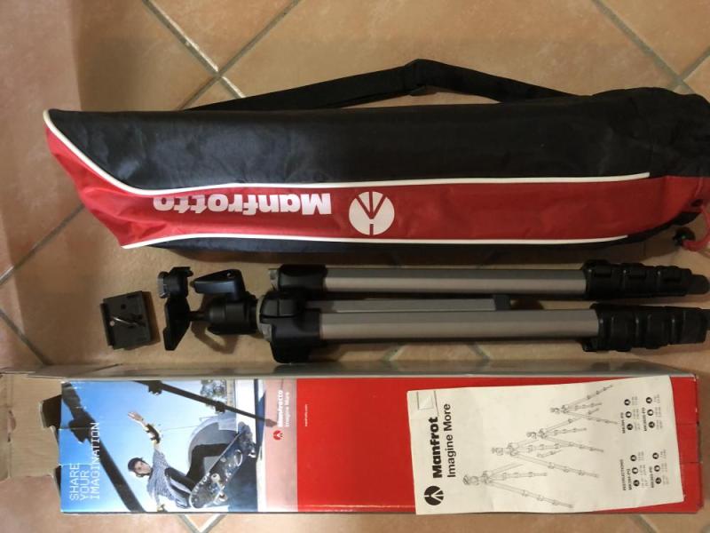 Cavalletto treppiede in alluminio con accessori, scatola e istruzioni originali. Ottime condizioni.