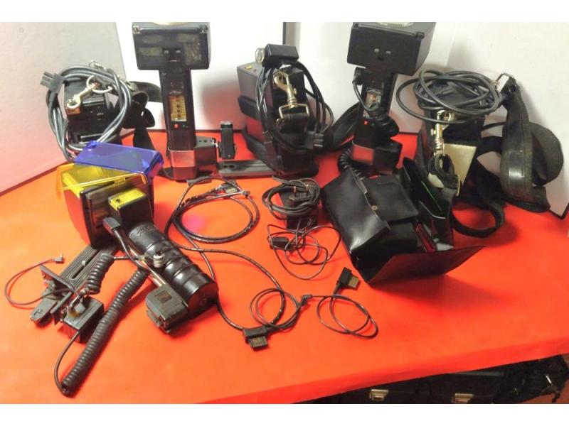 questa attrezzatura può essere impiegata in interni oppure per esterni notturni,,,i flash sono potenti ! fornisco anche 2 fotocellule Metz per collegamento dei 3 flash in modalità automatica e TTL(questi servo-flash i Mecalux buonissimi sono dotati di una piastrina per il blocco sicuro al corpo-flash !