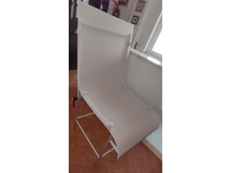 Tavolino da Still Life utilizzato un paio di volte, in ottime condizioni. Inclusi tre sfondi (nero, grigio, arancione) e libretto delle istruzioni per l'assemblaggio.
