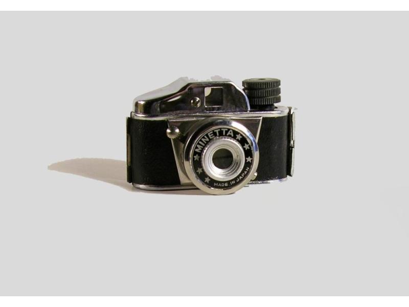La microcamera MINETTA è una fotocamera a fuoco fisso, con un solo tempo di scatto. L'otturatore è sempre pronto e l'ottica è un menisco. Utilizza pellicola 120 miniaturizzata. Completa di custodia originale. Usata ma in buone condizioni e funzionante.